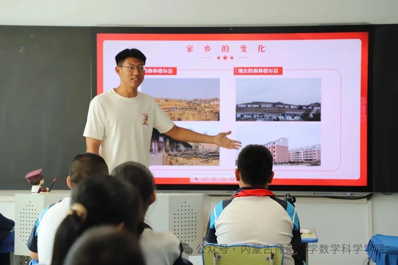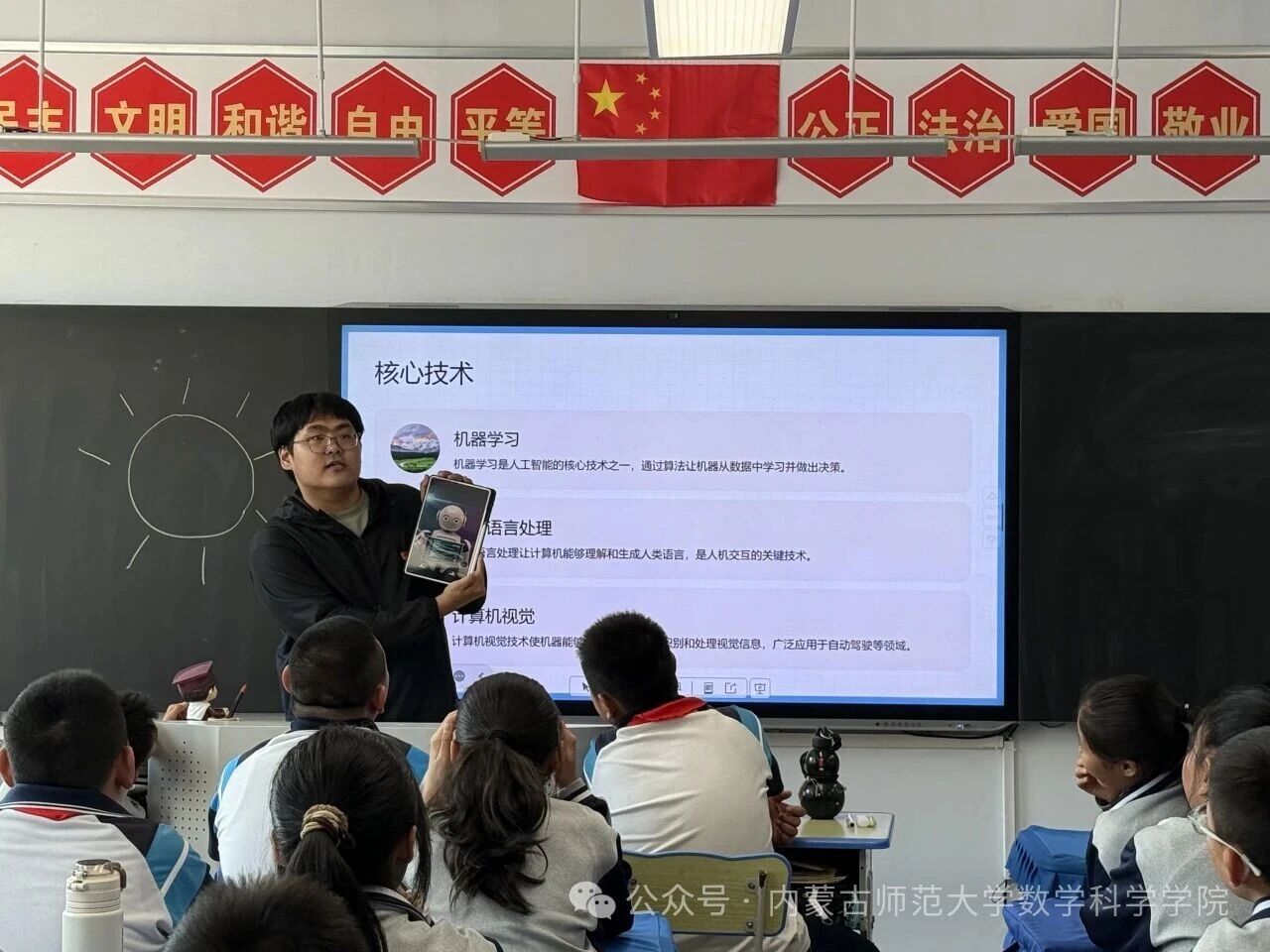 在和林格尔县乳业开发区第一小学,内蒙古科学技术普及学会兼职副秘书长、BEAT365英国官网BEAT365英国官网博士研究生乌日乐等一群研究生科普志愿者,他们用所学的“数据科学与智能信息处理”“基础数学”“应用数学”等学科专业,用通俗易懂的语言,为小学生普及“人工智能是什么”“人工智能会做什么”“机器是怎样看懂图像的”,通过活动让学生积极体验,在活动中感知科技、思考未来、收获新知。
