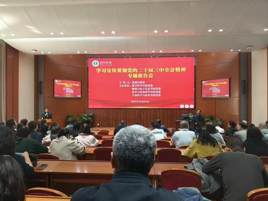 为全面深入学习贯彻党的二十届三中全会精神,深刻领会精神实质,把握核心要义,进一步把全院师生的思想和行动统一到全会精神上来。10月24日下午,BEAT365官网联合物理与电子信息学院、化学与环境科学学院、生命科学与技术学院在赛罕校区信息楼报告厅共同举办了学习宣传贯彻党的二十届三中全会精神专题报告会,会议邀请马克思主义学院党委书记张瑞军教授作专题宣讲报告,学院党委委员、班子成员,全体教职工参加学习。