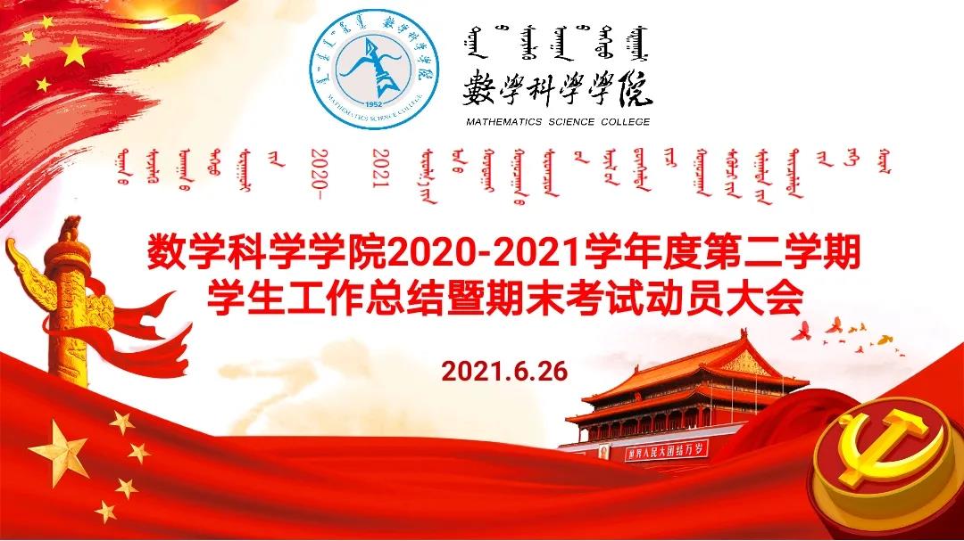 2021年6月26日下午,BEAT365官网2020-2021学年度第二学期学生工作总结暨期末考试动员大会于学院楼报告厅举行。本次大会由学院团总支书记皮建东老师主持,出席大会的领导和老师有:学院党委书记扎其劳教授,学院党委副书记、副院长季建光老师,学院副院长包霞副教授,学院学生思想政治工作辅导员、20级汉二班班主任刘勇波老师,20级蒙班班主任娜仁格日乐老师,20级汉一班班主任刘常彪老师。