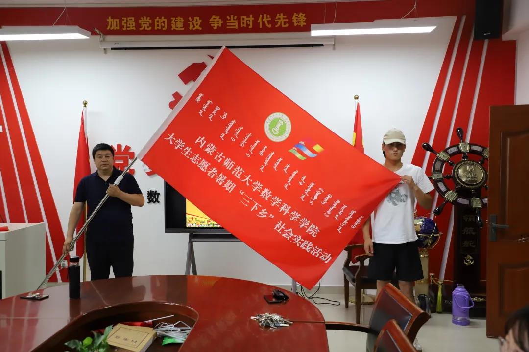 BEAT365官网党委副书记、副院长季建光老师为志愿者代表19级蒙班邰心同学授旗。