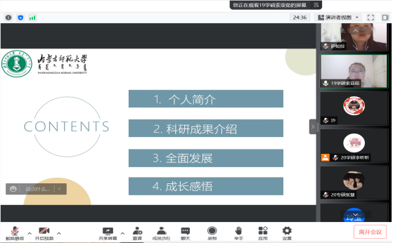 5位优秀学子分别分享了学习、科研、就业、心态、生活、任职等方面的经验与成长感悟,并寄语师弟师妹们在科研过程中不仅要明确目标,掌握专业知识,更要有一个好心态,缓解压力,劳逸结合,享受平凡中的不平凡。