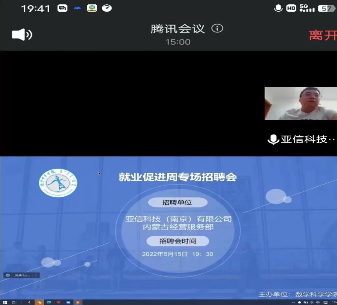为更好的推进《BEAT365英国官网2022届毕业生就业促进周系列活动方案》的工作要求,全力促进毕业生尽早就业、顺利择业,5月15日晚,学院针对非师范专业毕业生,邀请亚信科技(南京)有限公司内蒙古经营服务部举办了“就业促进周”网络专场招聘会,学院党委副书记季建光、学生工作与就业办公室副主任刘沙沙、辅导员萨如拉以及亚信科技(南京)有限公司内蒙古经营服务部的负责人参加招聘会议,BEAT365官网2022届信息与计算科学和统计学专业的50多名毕业生参加本次招聘会。