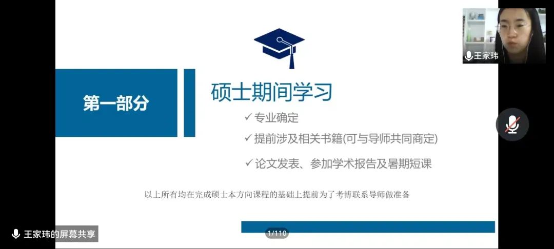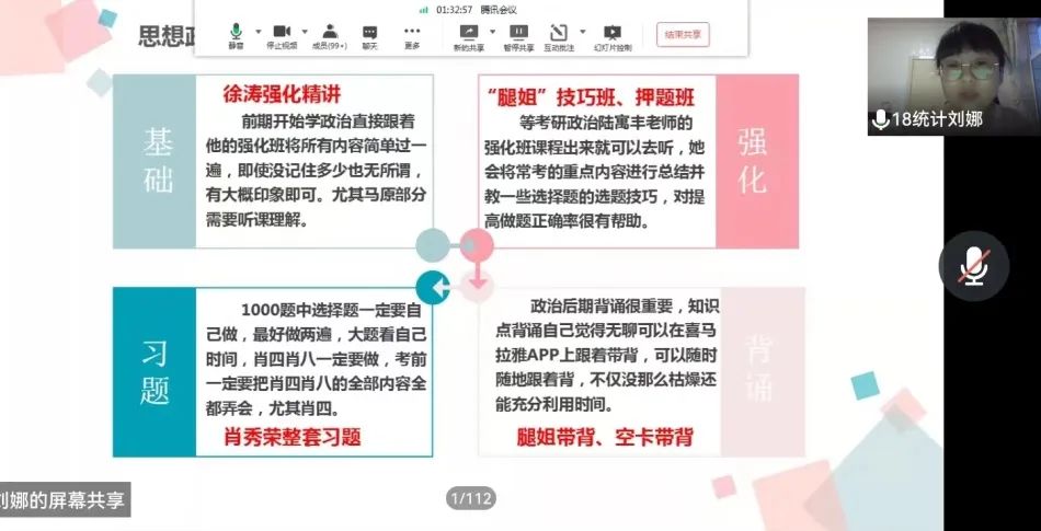 几位分享人精心准备了有关考研的相关知识,在会议中为同学们讲解了考研的备考方法、学习技巧、时间安排、考研规划、院校选择、保研流程、学科调剂、心态调整等多方面知识,她们结合自己的考研经历,学习过程,心态变化等为广大学生提供更多考研信息,并真挚的希望学弟学妹们以梦为马,不负韶华,拼搏努力,一战成硕。