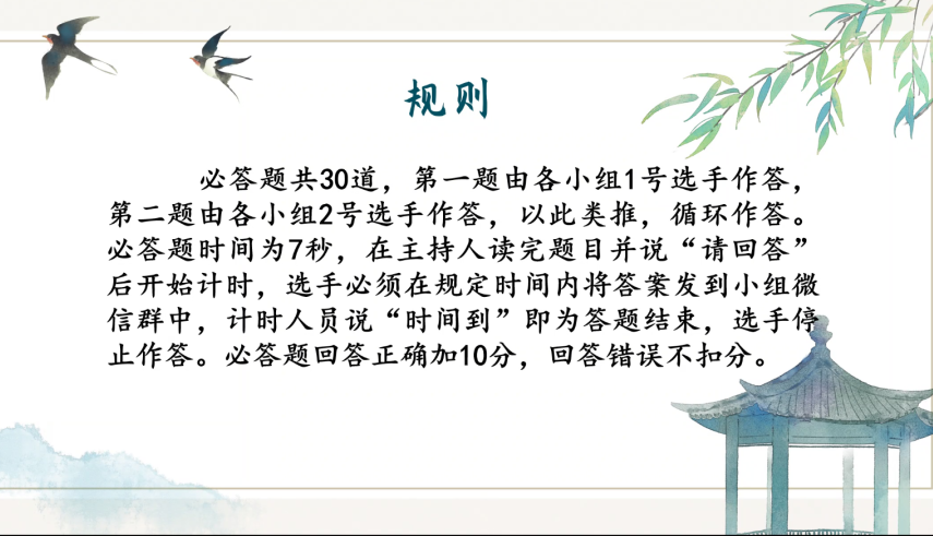 本次线上知识竞赛分为三个环节,分别为必答题环节、抢答题环节和加时赛环节,全面地考验了参赛选手们的对文学作品的知识储备量、反应能力以及临场的发挥。