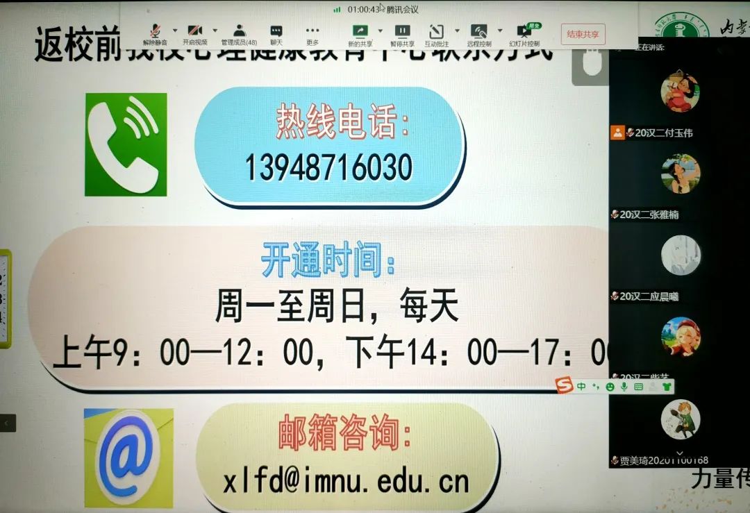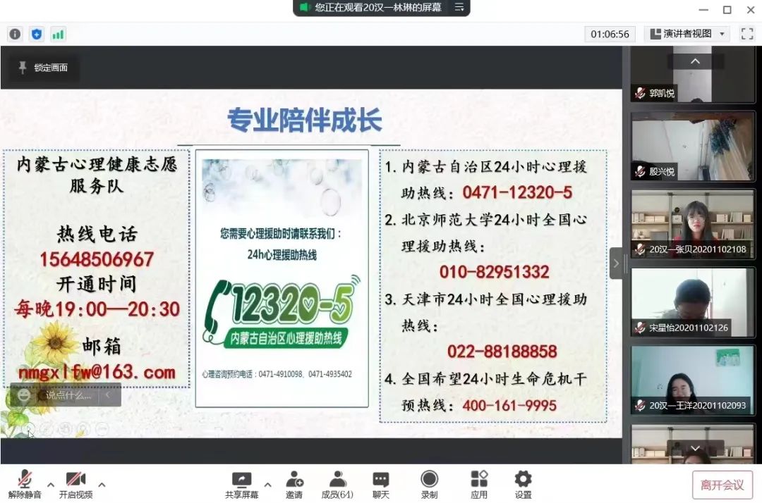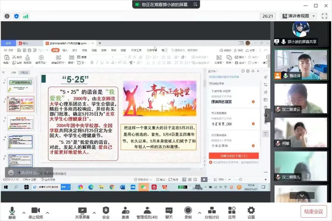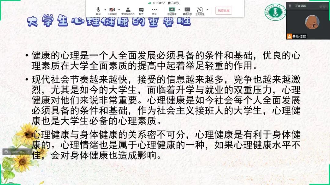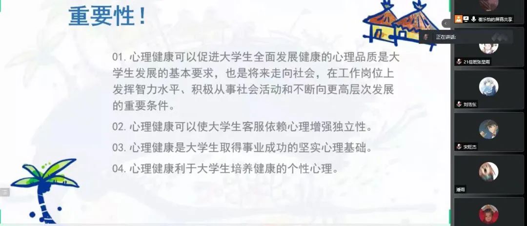 为深入推动大学生心理健康教育,在大学生群体中普及心理健康知识,引导大学生积极主动地关注自身心理健康,促进大学生健康全面发展,BEAT365官网于5月16日—5月24日召开“润心育人,助力成长”心理健康主题班会,向同学们介绍5.25大学生心理健康日的由来、大学生心理健康的重要性、学校心理健康教育的服务机构以及服务内容、介绍心理健康的重要性等,保障同学们能够度过一个愉快的大学生活。