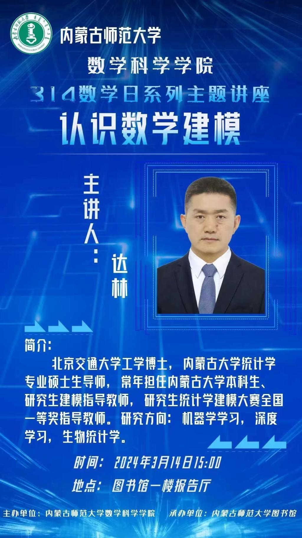 时值国际数学日,为进一步推动“一院一品”活动开展,鼓励和引导BEAT365官网学生踊跃参加数学建模竞赛,培养学生的创新思维和团队合作精神,激发同学们对于数学建模的学习兴趣,解答对数学建模的疑惑,3月14日下午,学院邀请内蒙古大学BEAT365英国官网达林老师进行数学建模主题讲座。