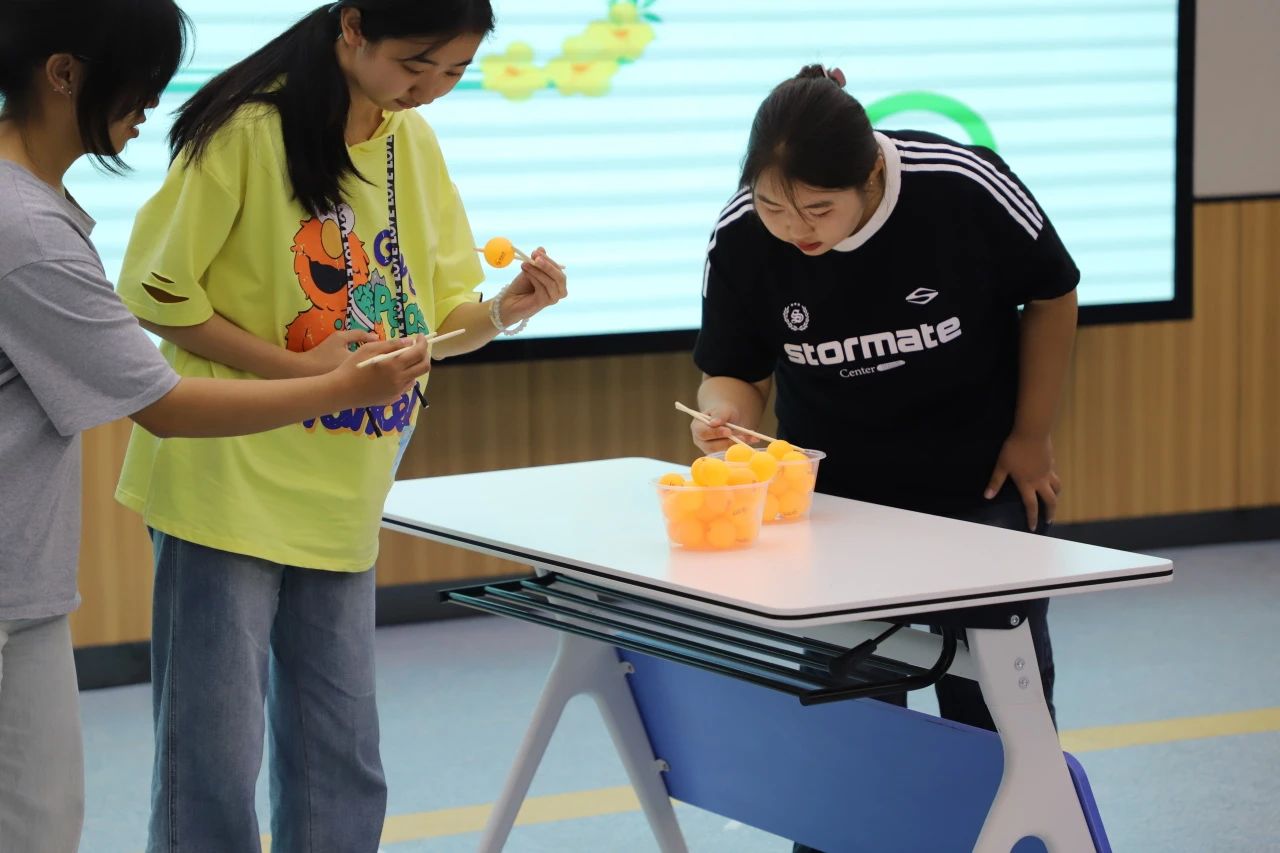 双龙戏珠项目以宿舍为单位进行比赛,同学们根据比赛规则商议好策略,用筷子小心翼翼地夹起一颗颗乒乓球向下逐一传递,每当成功运输一颗乒乓球时,总能引来一阵阵欢呼声与掌声。当传递失败时,任何人没有沮丧与埋怨,有的只是鼓励的话语和和谐的笑声。