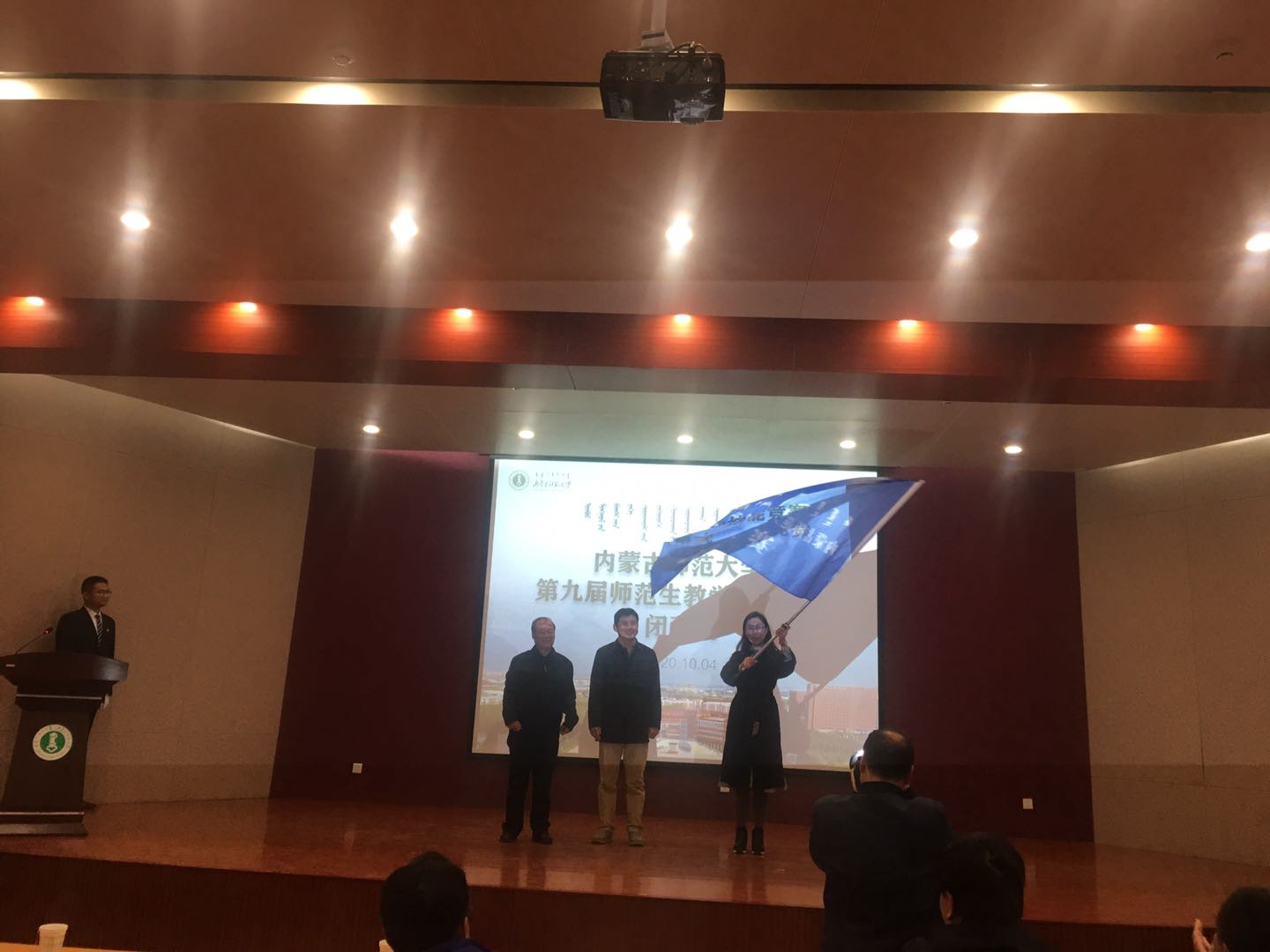 最后,BEAT365官网作为第十届师范生教学技能竞赛承办方,副院长包霞、教务处处长韩巍从教育学院院长米俊魁手里接过了赛旗。