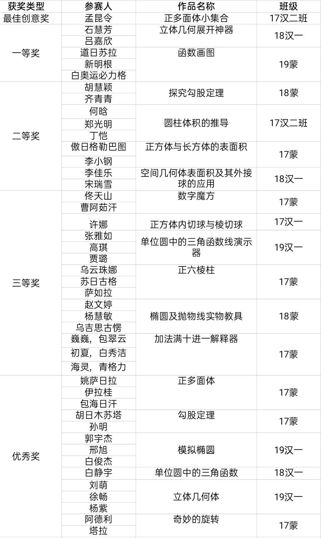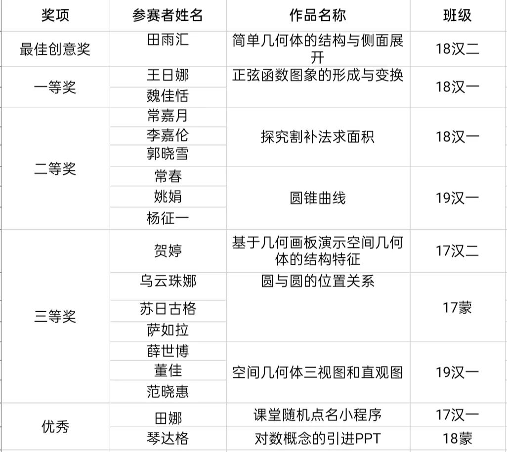毕力格图老师讲到,教具在数学课上起着举足轻重的作用,很多知识学生理解起来很困难,但通过教具演示,容易理解,便于教学。老师肯定了同学们对比赛的努力,也指出了选手们存在的不足,一些参赛作品只是对应用软件的简单应用,缺少创新,希望同学们之后可以不断优化完善作品,以后可以真正运用到工作实践中去。