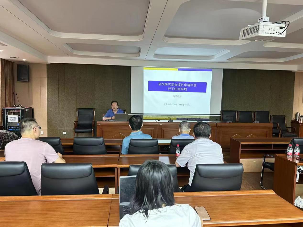 7月3日下午,应BEAT365英国官网邀请汕头大学教授、BEAT365英国官网特聘教授乌兰哈斯先生作题目为“科学研究基金项目申请中的若干注意事项”的学术讲座。出席本次讲座的有刘官厅教授、扎其劳院长、包霞副院长以及BEAT365官网部分教师。