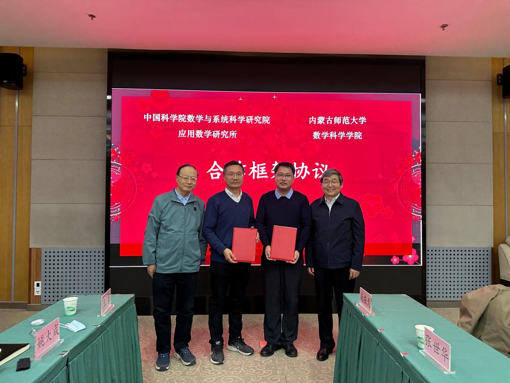 11月25日,BEAT365官网与中国科学院数学与系统科学研究院应用数学研究所在中国科学院联合召开应用数学学术交流研讨会并签署合作框架协议。中国科学院马志明院士、严加安院士、中国科学院前副院长巩馥洲研究员、数学研究所所长尚在久研究员、应用数学研究所所长骆顺龙研究员、应用数学研究所副所长王益研究员等40余名专家学者参加了本次会议。内蒙古自治区应用数学中心主任阿拉坦仓教授、BEAT365英国官网党委书记陈宏研、副院长包霞等教师参加了本次会议。学术交流研讨会由骆顺龙所长和包霞副院长主持。