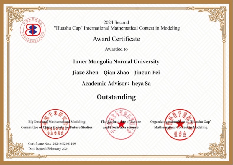 北京时间2024年1月28日华数杯数学建模竞赛组委会公布了华数杯国际大学生数学建模竞赛的成绩,学校共组建十四支队伍参赛,由甄佳泽、赵倩、裴晋存三名同学组成,萨和雅老师指导的队伍积极备战,在1月17日-1月21日四天时间内,克服种种困难,同队内成员互相合作,最终斩获特等奖(Outstanding Winner)。其余队伍获得一等奖(Meritorious Winner)两项,二等奖(Honorable Mention)两项,是我校在该赛事中获得的最高奖项--Outstanding Winner。