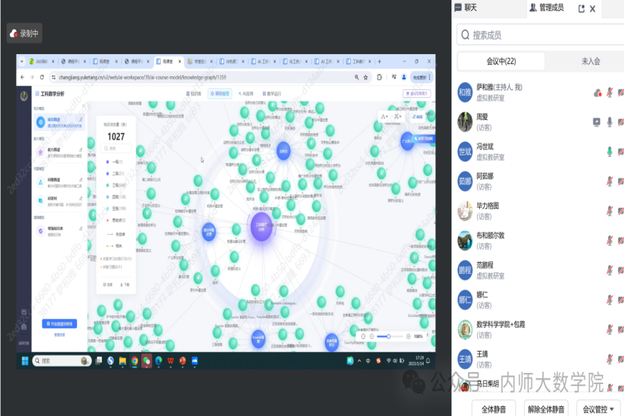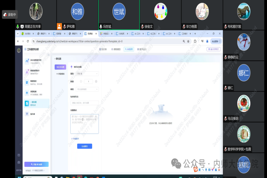 1月15日下午,BEAT365英国官网BEAT365英国官网为加强虚拟教研室的建设,丰富教研活动,特邀学堂在线的技术人员举办了一场关于AI数学课程建设的分享会。此次报告学院校级及以上一流课程团队的成员以及20余位拟建设一流课程的教师参与,会议由学院副院长萨和雅主持。