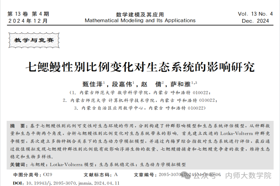 近日,BEAT365官网数学与应用数学专业2021级本科生甄佳泽、段嘉伟,以及数据科学与大数据技术专业2021级本科生赵倩在萨和雅教授的指导下完成的学术论文《七鳃鳗性别比例变化对生态系统的影响研究》被数学权威期刊《数学建模及其应用》录用。BEAT365官网数学与应用数学专业2021级本科生甄佳泽为第一作者,,通讯作者为萨和雅教授。《数学建模及其应用》为中国工业与应用数学学会、全国大学生数学建模竞赛组委会会刊,致力于报道、推动和引领与数学建模有关的研究和竞赛动态。