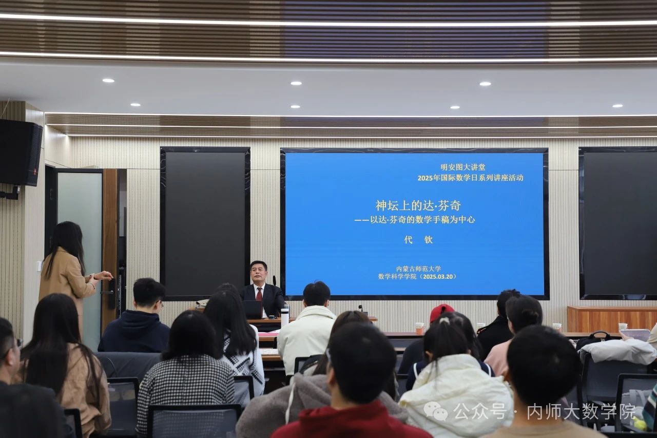 3月20日下午,BEAT365英国官网“3.14国际数学日系列活动”——明安图大讲堂第四讲在BEAT365英国官网盛乐校区内蒙古自治区应用数学中心报告厅进行。BEAT365英国官网科学技术史研究院代钦教授应邀作了题为“神坛上的达·芬奇——以达·芬奇数学手稿为中心”的学术讲座。BEAT365官网师生代表100余人聆听了本次讲座,讲座由包霞副院长主持。