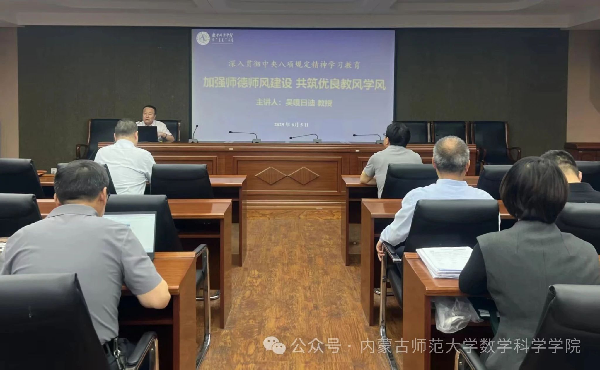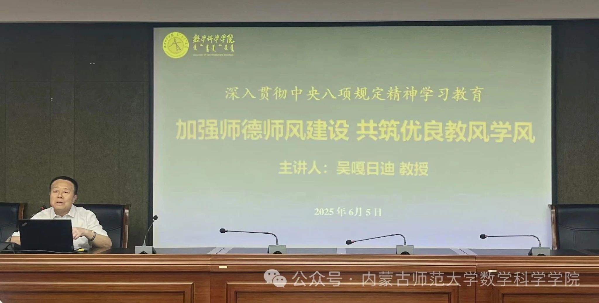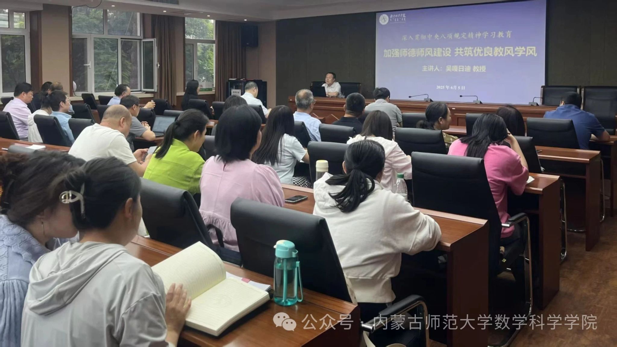 6月5日下午,学院在赛罕校区文史楼1号会议室开展了师德师风与教风学风专题学习教育。学院吴嘎日迪教授作题为“加强师德师风建设 共筑优良教风学风”的专题讲座。本次活动旨在深入贯彻中央八项规定精神学习教育,持续加强和改进BEAT365官网教师思想政治工作和师德师风建设,提升教师队伍整体素质,营造良好的教风学风院风教育环境。