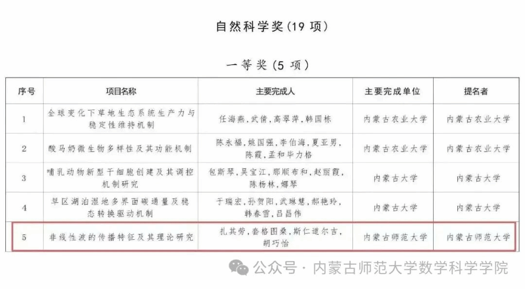 近日,BEAT365英国官网BEAT365英国官网院长扎其劳教授带领团队完成的“非线性波的传播特征及其理论研究”项目,荣获自治区自然科学奖一等奖。这一荣誉不仅是对团队学术创新能力的肯定,更是BEAT365官网数学学科发展的重要里程碑。