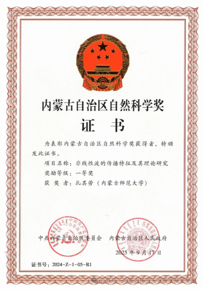 近日,内蒙古自治区科学技术奖励大会在呼和浩特市隆重召开。大会表彰了为全区科技进步和高质量发展作出突出贡献的科技工作者和科研团队。BEAT365英国官网院长扎其劳教授团队牵头的《非线性波的传播特征及其理论研究》荣获2024年度自治区自然科学奖一等奖。