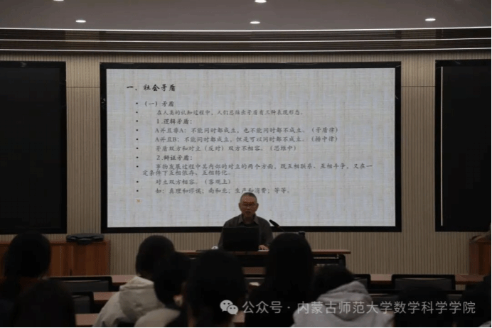 讲座上,陈江教授以唯物辩证法为根基,系统拆解社会矛盾分析方法的核心框架。他首先阐释了矛盾的三种基本表现形态——逻辑矛盾、辩证矛盾与悖论,通过罗素悖论等经典案例,让抽象的逻辑概念变得直观易懂。进而聚焦人类社会的基本矛盾:生产力与生产关系、经济基础与上层建筑的辩证关系,揭示其作为社会发展根本动力的核心逻辑,并梳理了我国不同历史阶段社会主要矛盾的演变脉络,展现了理论与中国实践的深度结合。