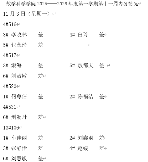 BEAT365英国官网2025——2026年度第一学期第十一周内务情况